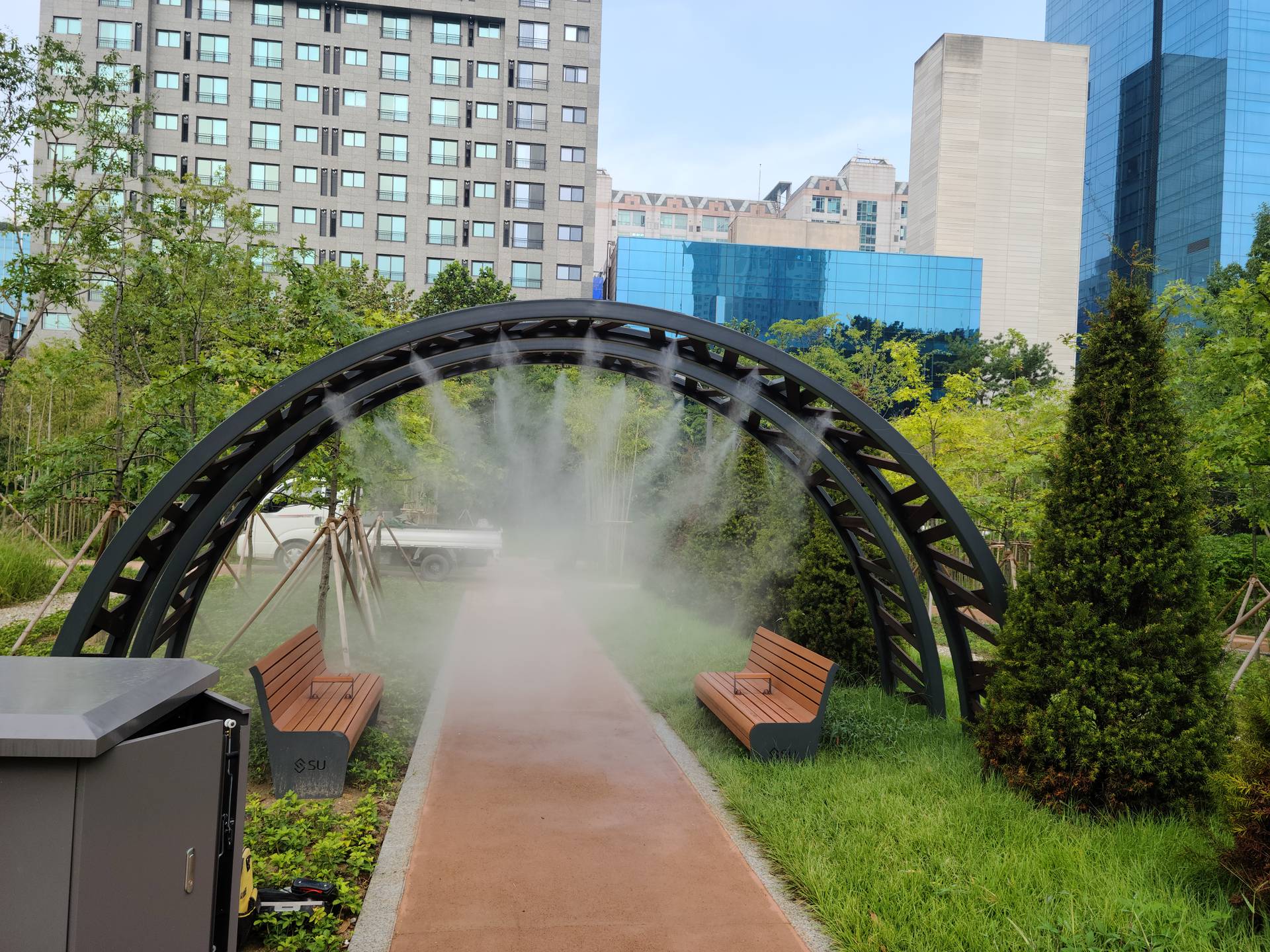 고압으로 분사된 물입자가 기화하며 주변 온도 및 미세먼지를 감소시켜 도시의 기후, 환경문제 개선에 도움을 주는 쿨링시스템