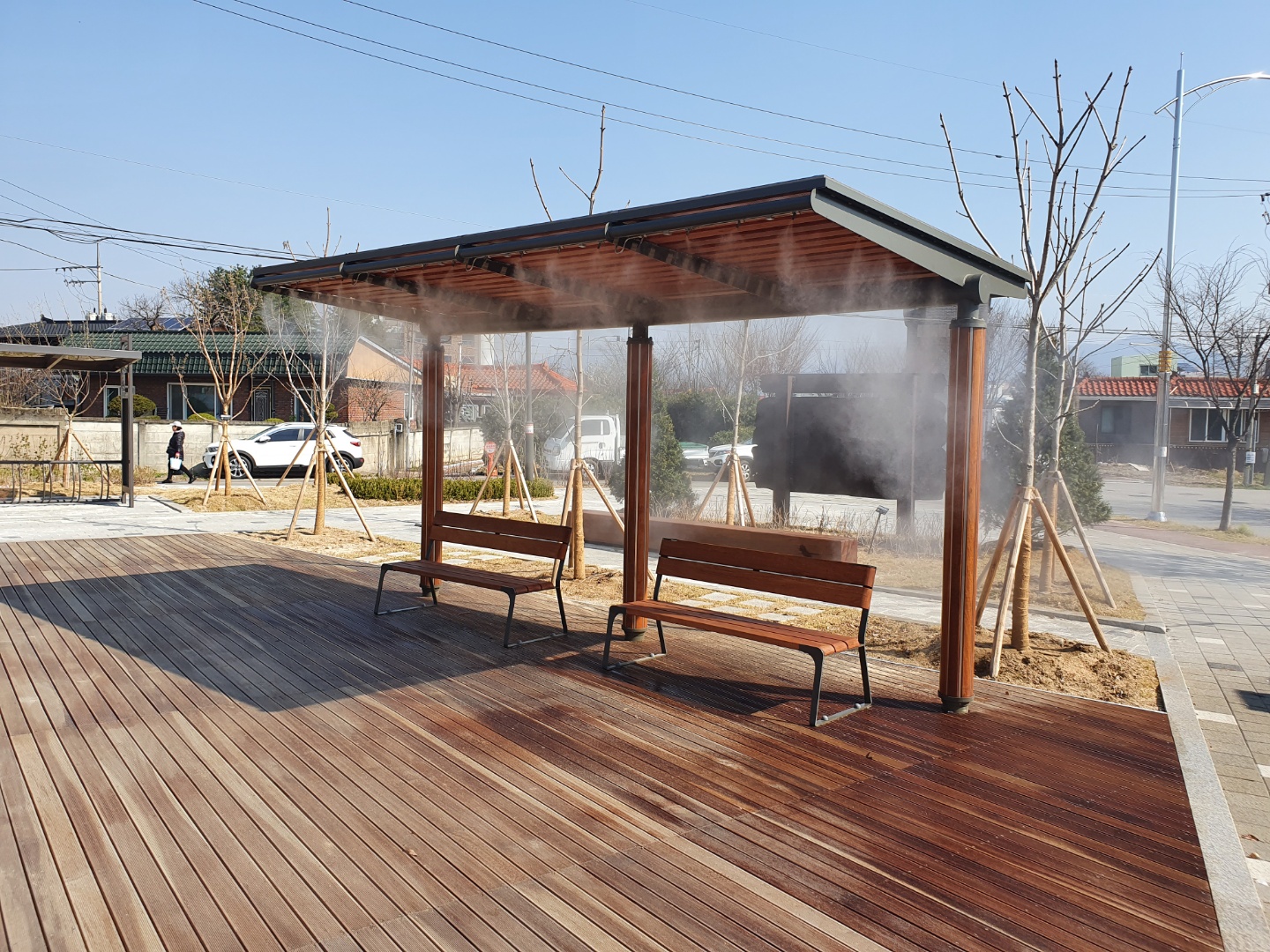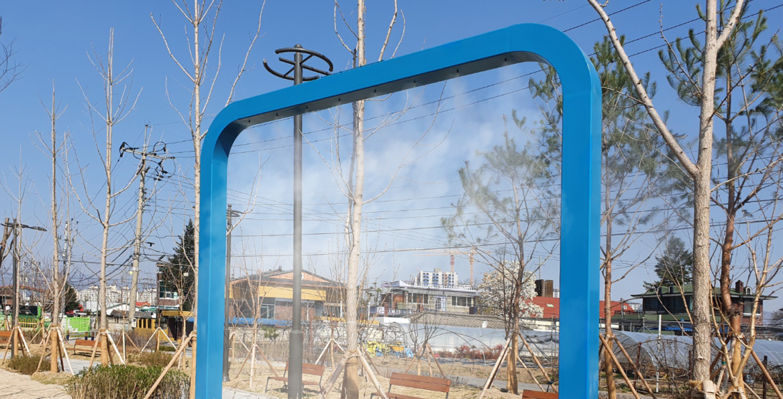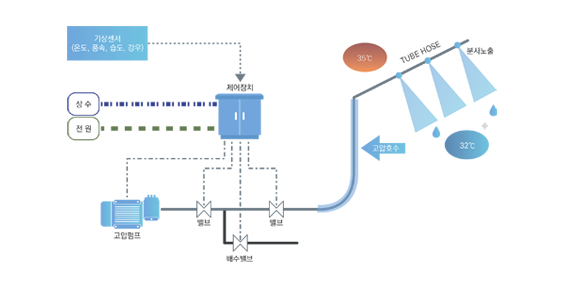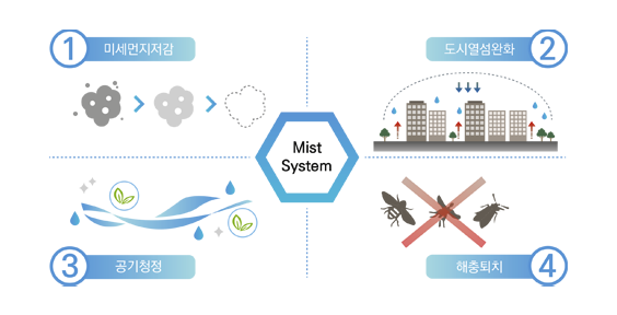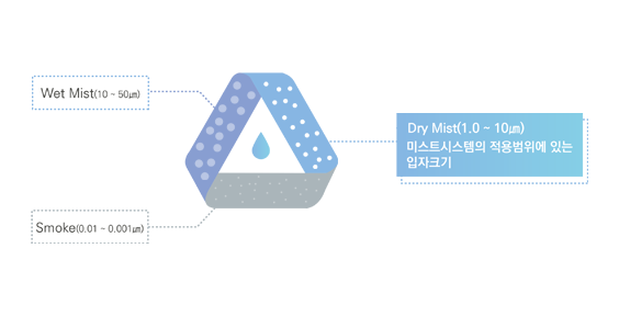고압의 물이 노즐을 통과함으로써 평균 10micron의 크기 물분자로 분사되어 표면적을 증가시키고 공기중의 열에너지를 기화시켜 주변 온도를 낮춘다.